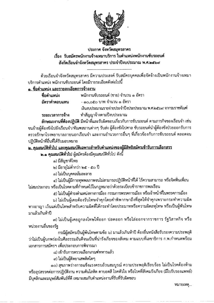 ประกาศรับสมัครพนักงานจ้างเหมาบริการ ในตำแหน่งพนักงานขับรถยนต์ สังกัดเรือนจำจังหวัดสมุทรสาคร ประจำปีงบประมาณ พ.ศ. 2569